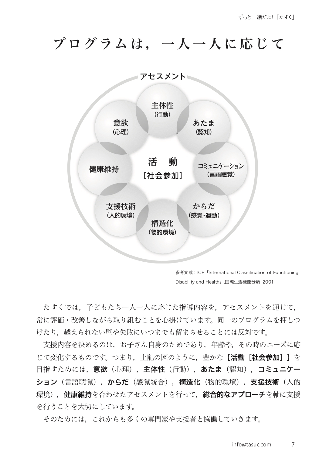 「プログラムは一人ひとりに応じて」 脳科学、構音などの器官、心、身体、行動、認知、物的環境、そして人的環境。トータルなアプローチこそ、療育に大切な視点です。複雑ですがそれを使いこなせなければ、子どもの育ちの手助けとなりません。