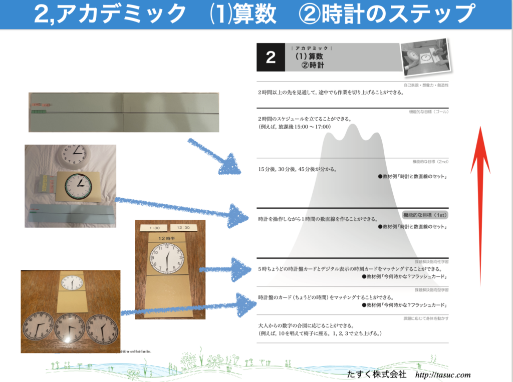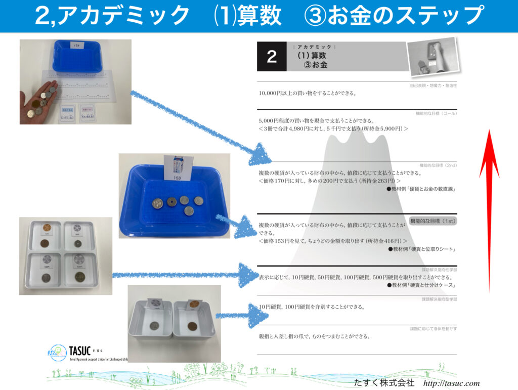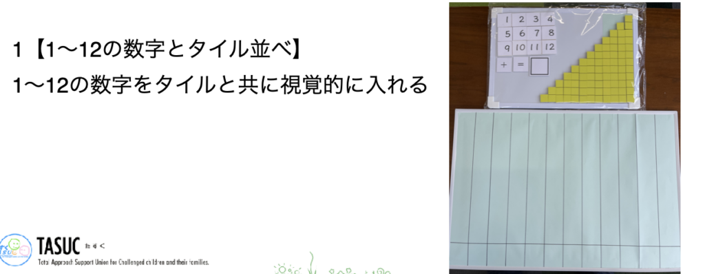 数字の概念がわからないと逆算ができないので、まずはタイル並べなどで数字の概念を教え、徐々に機能的な目標へと上げていきます。