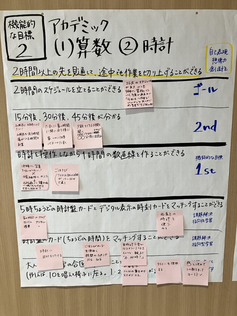 恒例のワークでは、各々のお子さんの機能的な目標の段階をチェックした後、「生活の中でこれできそう!」「こんなことができるようになりたい!」という項目を出し合いました。