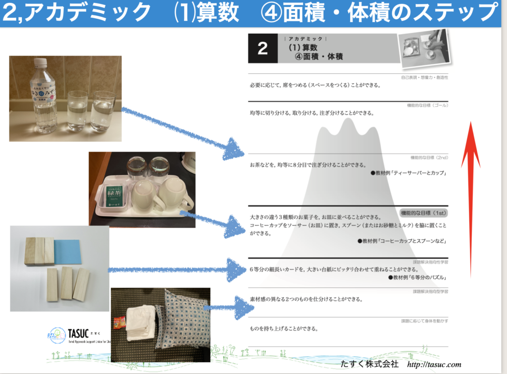 例えば、ホールケーキをその場にいる人数を見て、人数分に均等に切り分けられるか?ペットボトルのお茶を均等に注ぎ分けられるか?日常的によくある機能的なスキルですね。