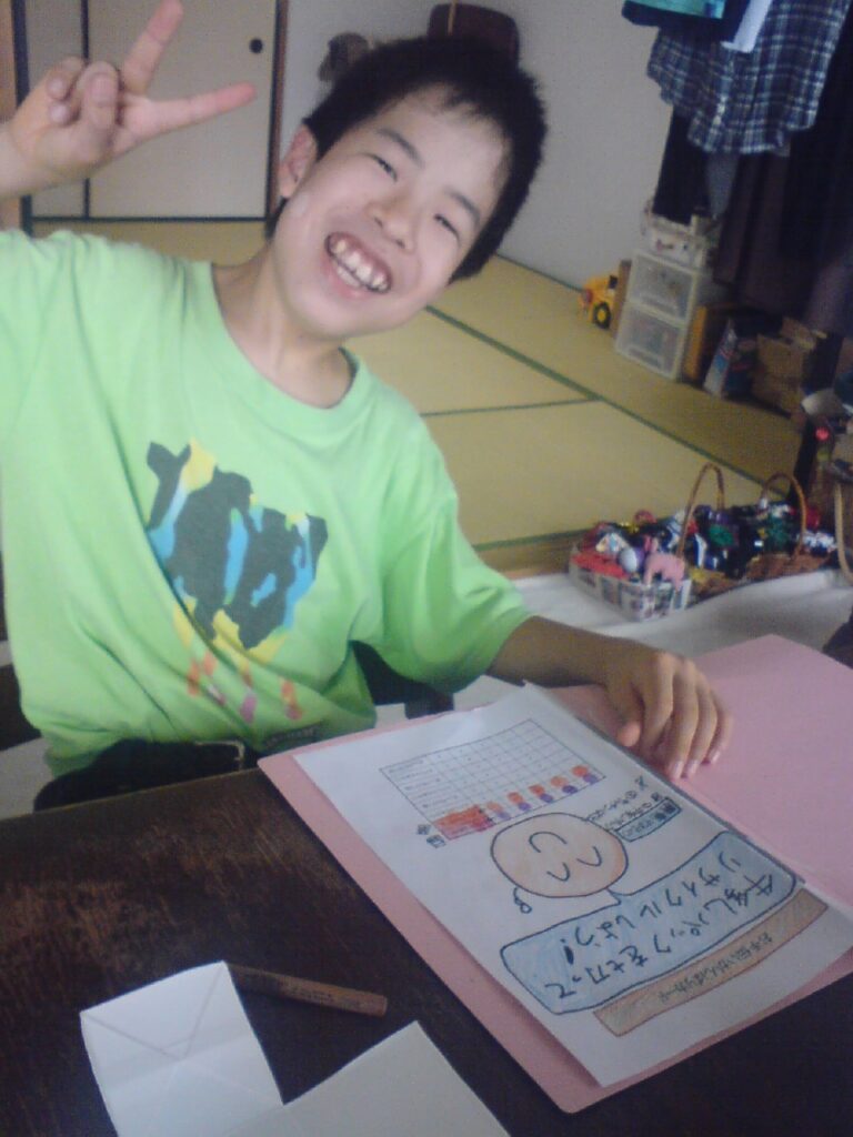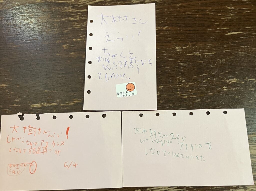 文章はわかりやすく、パターン化しました。最初に、「大樹さん、すばらしい!」といったほめる文章で始めて、(ちなみに名前は、仮面ライダーにハマっていたヨッシーが、その時の変身前の仮面ライダーの名前にして欲しいというのでこの頃は大樹さん)ほめる内容を続けて書き、最後に「お母さん嬉しいな」で締めるという形です。