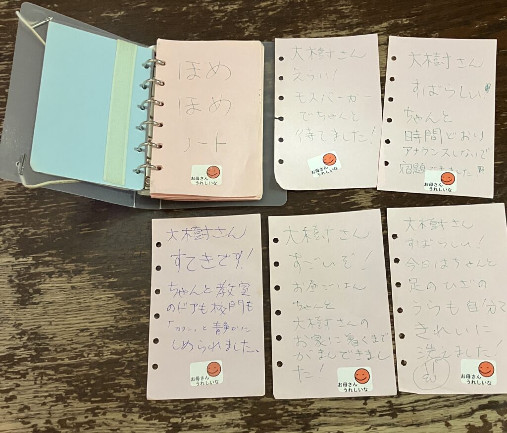 外出先で良い行動をした時、即書いてやることができるように携帯できる小さいファイル帳に綴じ、貯めて行きました。