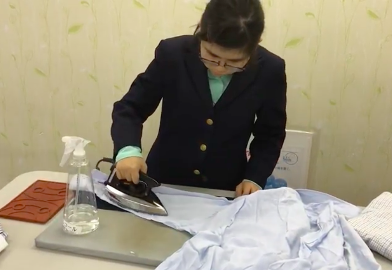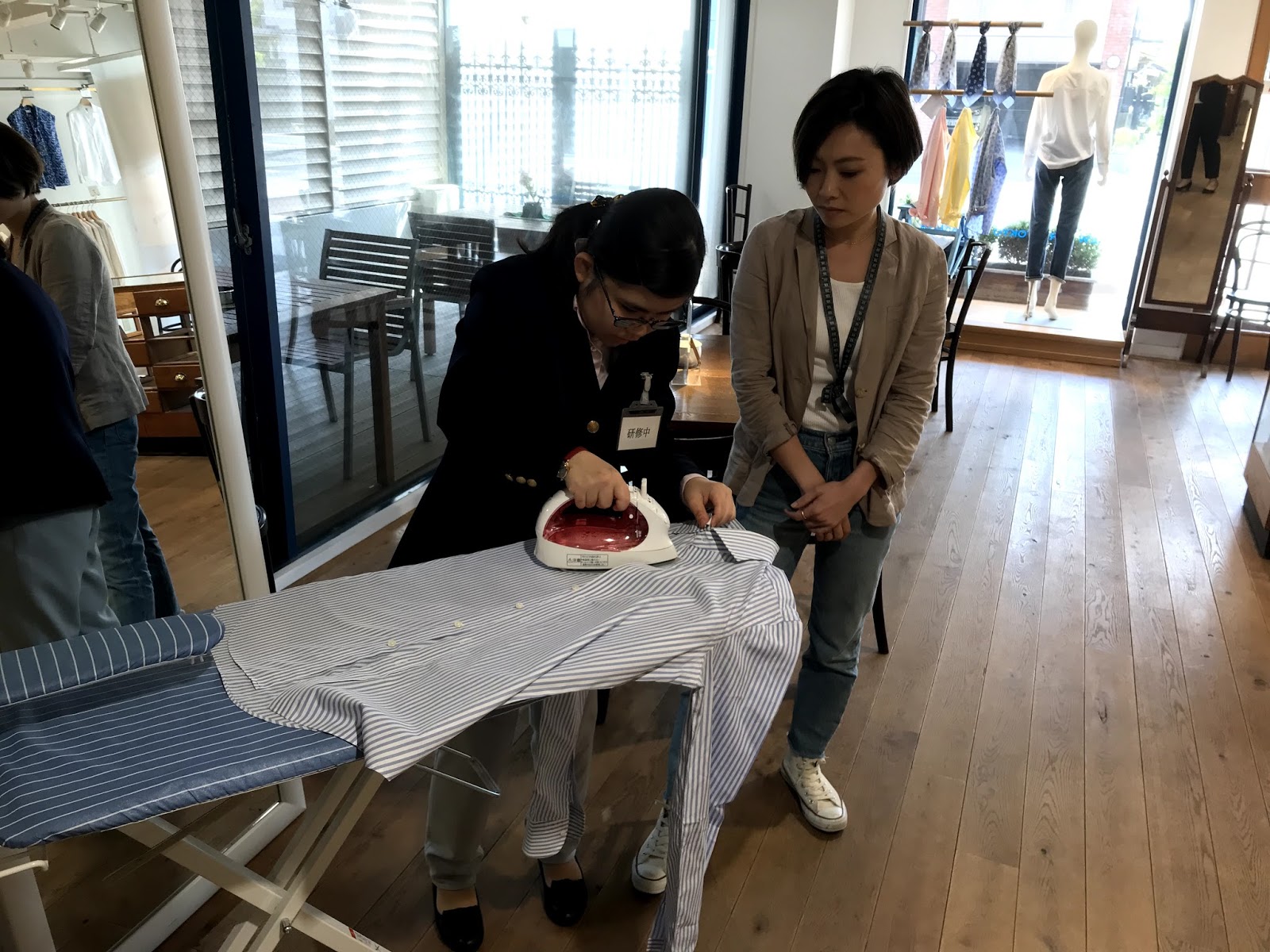 | 店内にディスプレイするシャツにアイロンをかけるための指導を受ける |