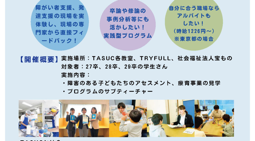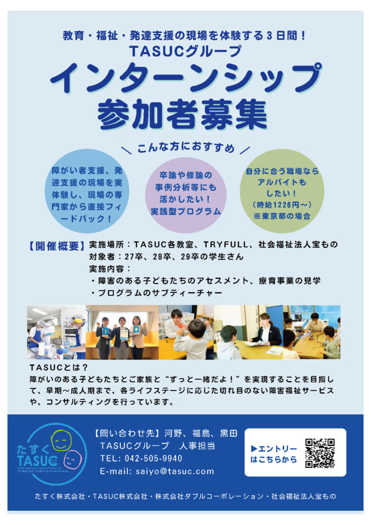 インターンでは、早期の段階から自立して働く青年期までを見据えて考えられた、充実したTASUCの教材やプログラムに圧倒されました。そして、TASUCの教室スタッフにはそれらがどういう意味をもっているのか、私にもわかりやすく教えていただきましたし、私も自分の専門性はどこで発揮されるのかを考えながら実習に取り組むように意識していました。