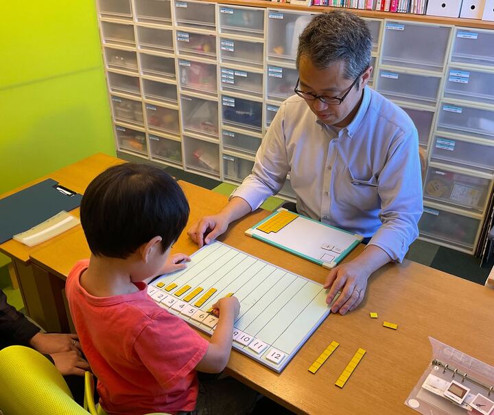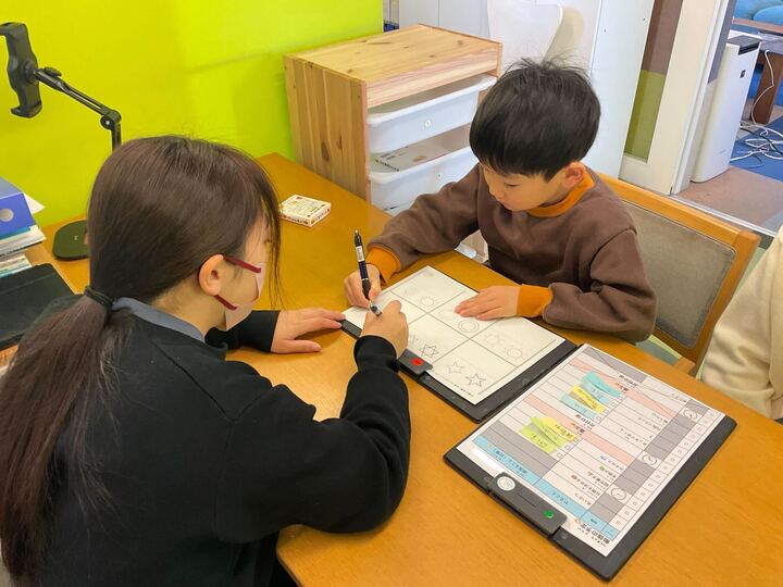 入会当初は、パズルに取り組むたった5分間でも、身体がゴソゴソと動いてしまい、姿勢を保つことが難しい様子が見られました。左手を机に置き、上体を起こして座る姿勢がとれるようになることをねらいとして設定しました。お勉強をする課題は、本人が"ちょっと頑張れば達成できる"ものから。「今日もいい姿勢で課題に取り組めた」という経験を大切にしながら、少しずつ課題の内容や量を調整し、コツコツ取り組んできました。