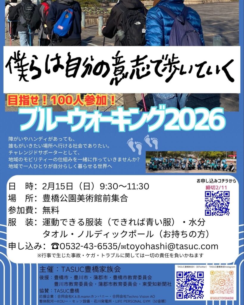 豊橋まつり、SEBONE、そして今回のブルーウォーキング。これらの取り組みをとおして、TASUCとして 地域に向けた理解啓発活動を、また一歩進めることができました。特別な説明をしなくても、歩く姿や関わる姿そのものがメッセージになる。ブルーウォーキングは、そんな場でもあります。