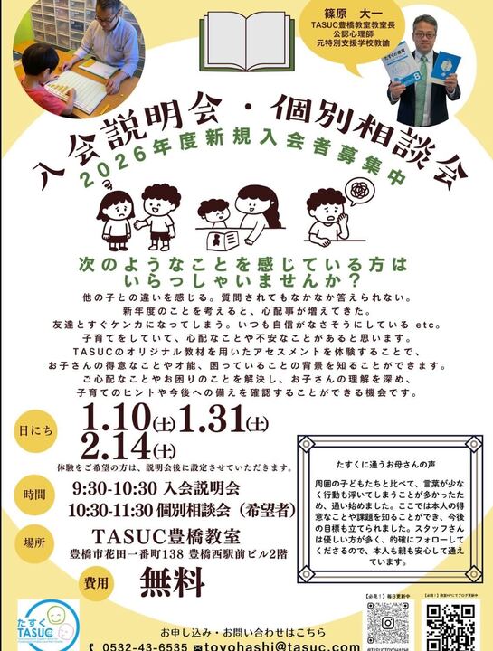 「ちょっと気になるな」と感じたら、どうぞひとりで悩まずにお気軽にTASUC豊橋教室へご相談ください。私たちスタッフは、保護者の皆さまとしっかりコミュニケーションを取りながら、お子さんに合った療育のプログラムを一緒に考えていきます。