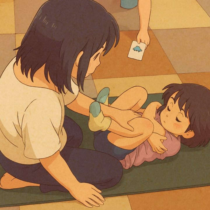 最初に課題として取り組んだのは、仰向けに寝た状態で、膝を抱えて身体を丸める「たまごのポーズ」です。これは、お腹に力を入れる感覚を育てるための運動です。
