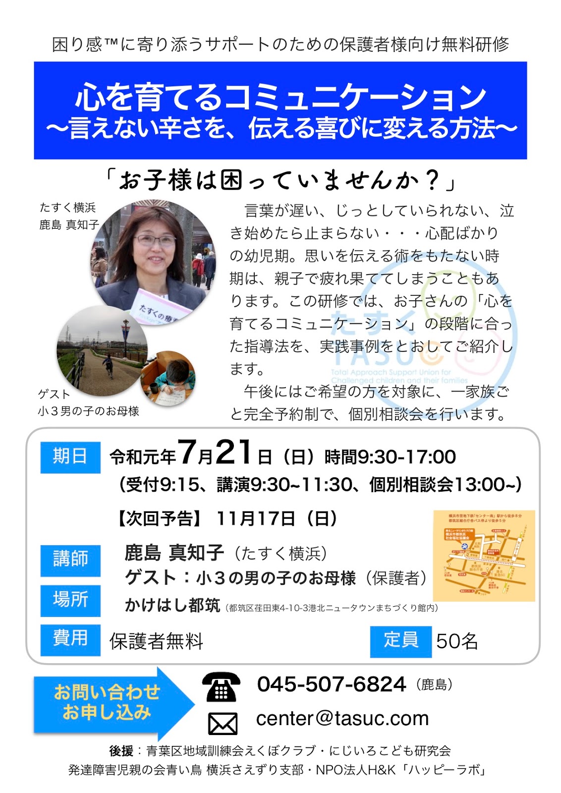 さて、たすく横浜教室では、7月21日(日)に第2回子育て講演会を開催します。