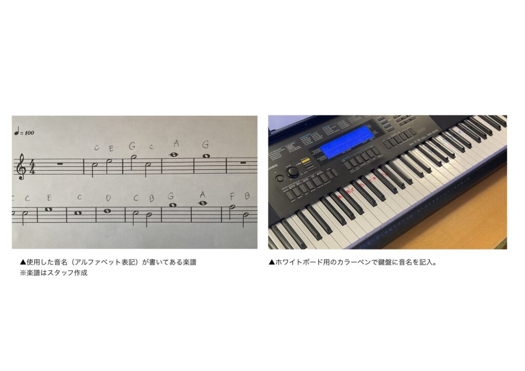 言語だけで説明したり、伝えて理解することは少し難しいメンバーも。そこで、楽譜に書いてある音をアルファベットでも表記し、鍵盤にも同じようにアルファベット(音名)を書き、楽譜の音と鍵盤の場所をマッチングできるようにしました。